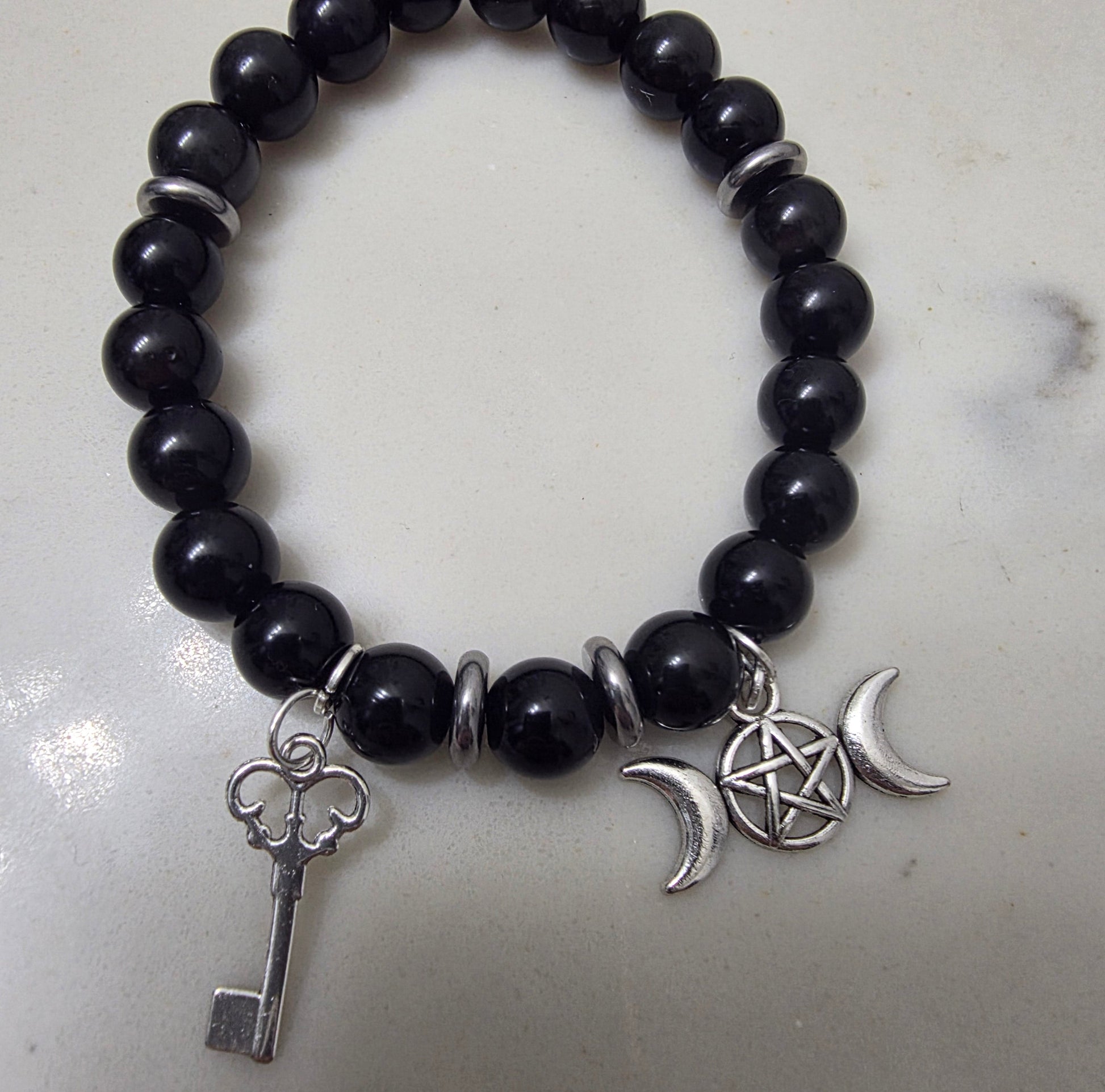 Adorned with a skeleton key charm, symbol of hidden doors and spiritual unlocking, and the Triple Goddess symbol, honoring Hecate as Maiden, Mother, and Crone—guide of crossroads, intuition, and inner power.