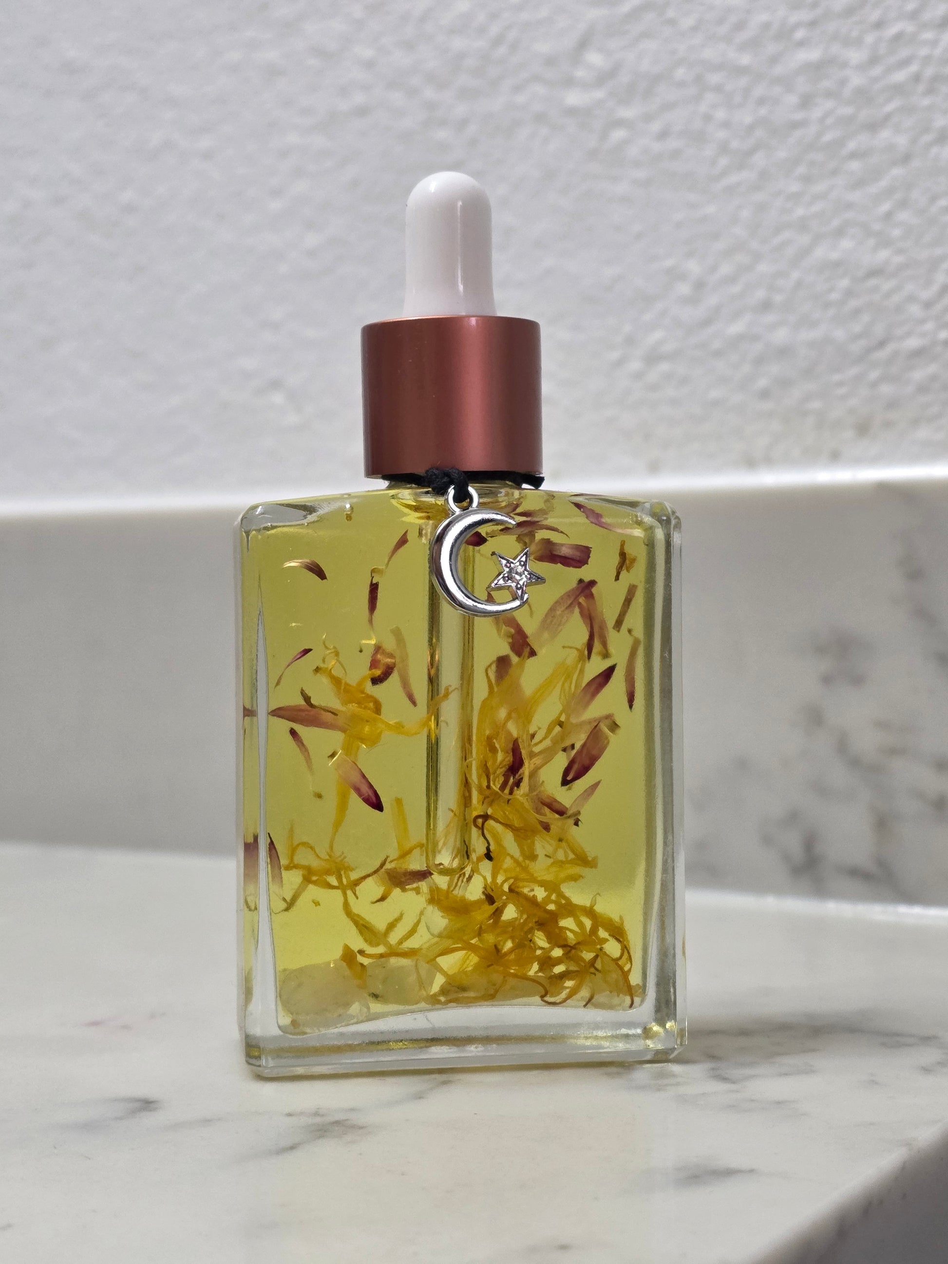 Calendula soothes skin irritation and helps with inflammation and is associated with warmth, happiness, and positivity, promoting emotional well-being.